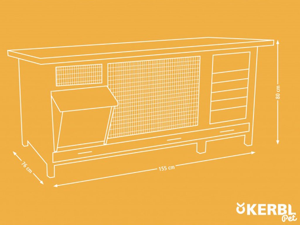 Vnější rozměry celé králíkárny jsou 155x76x80 cm, vnitřní výška kotce je 60 cm. Výška vyjímatelného plastového trusníku je 6 cm.