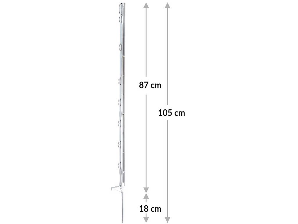 Plastový sloupek pro elektrický ohradník, pro dráty, pásky a lanka, pozinkovaný hrot, vysoká stabilita, délka 105 cm. Objevte perfektní a praktický sloupek pro vytvoření elektrického ohradníku! Tento plastový sloupek je vyroben z kvalitního materiálu s podélným vyztužením, díky čemuž je velmi odolný a vysoce stabilní. Sloupek je určený pro běžné pásky, dráty a lanka pro elektrický ohradník. Díky pozinkovanému hrotu a jednostrannému nášlapu je instalace do země velmi jednoduchá. Celková délka sloupku je 105 cm, z toho 18 cm je samotný hrot do země, který zajišťuje stabilitu.