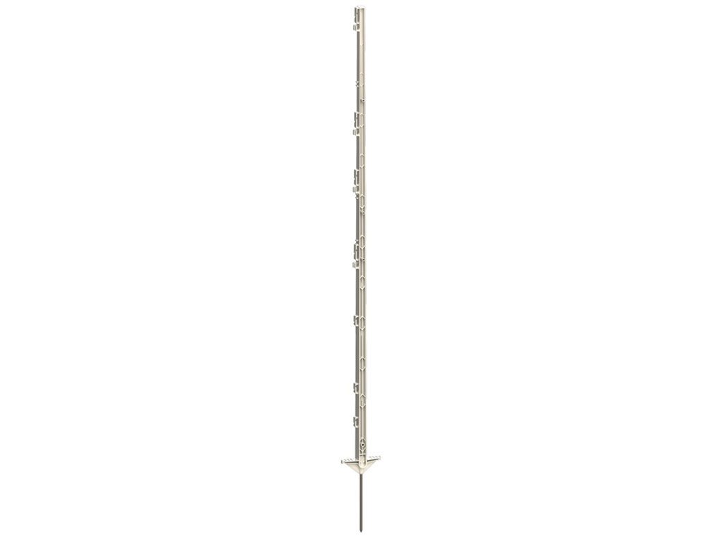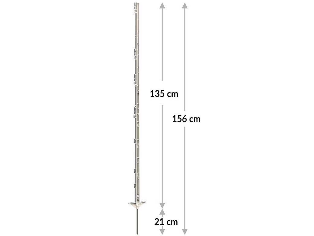Plastový sloupek pro elektrický ohradník z vysoce kvalitního plastu, pro dráty, pásky a lanka, vysoká odolnost, pozinkovaný hrot, délka 156 cm. Objevte perfektní a praktický sloupek pro vytvoření elektrického ohradníku! Tento plastový sloupek je vyroben z velmi kvalitního materiálu, vyztužený skelným vláknem, a díky tomu odolá i v náročnějších povětrnostních podmínkách. Sloupek je určený pro běžné pásky, dráty a lanka pro elektrický ohradník. Díky pozinkovanému hrotu a dvojitému nášlapu je instalace do země velmi jednoduchá. Celková délka sloupku je 156 cm, z toho 21 cm je samotný hrot do země, který zajišťuje stabilitu.