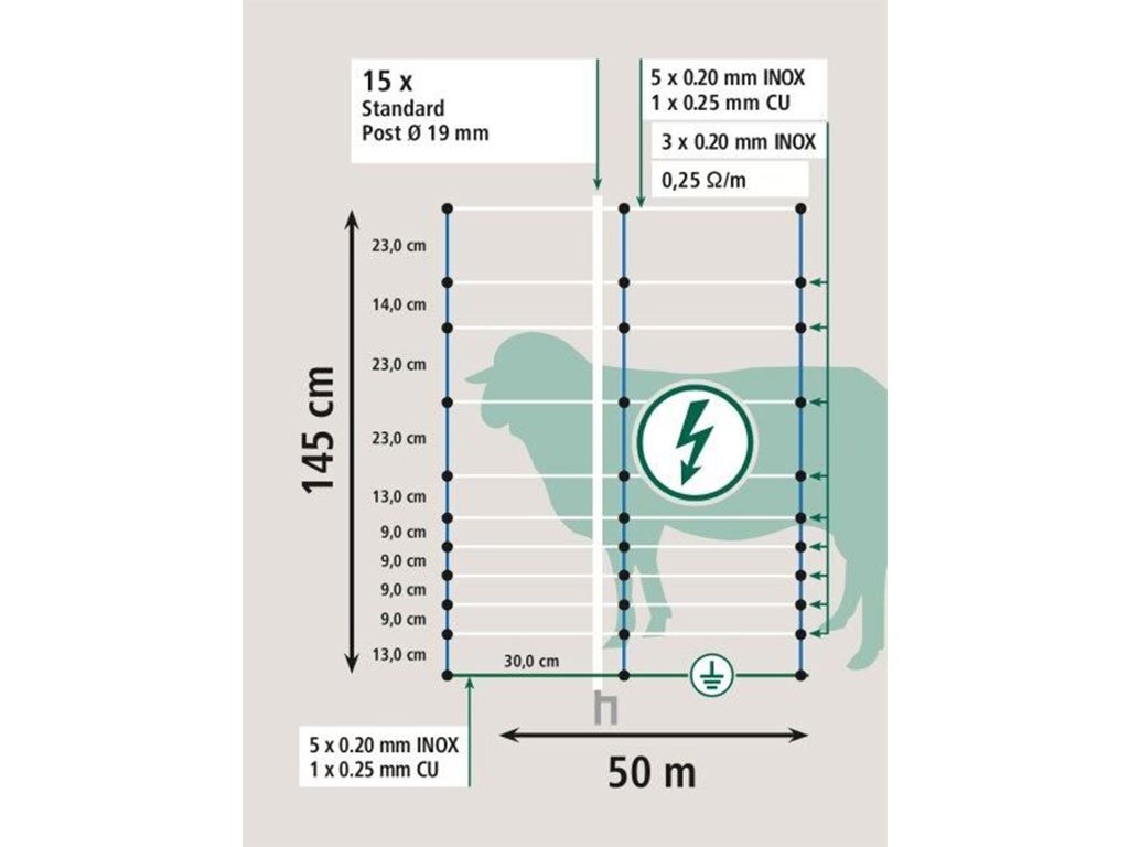 Ohradníková vodivá síť proti vlkům, výška sítě 145 cm, délka sítě 50 m, 15 extra tyček s dvojitým hrotem, 11 vodorovných pramenů. Hledáte spolehlivý způsob, jak efektivně chránit svá zvířata před vlky a zároveň jim bezpečně vymezit prostor? Máme pro vás špičkové řešení! Nejvyšší síť řady TitanNet s výškou 145 cm nabízí vysokou úroveň ochrany proti predátorům i útěkům. Zesílený horní vodič s nízkým odporem zajišťuje rovnoměrný a silný elektrický impulz, který zvyšuje bezpečnost ohradníku. Extra pevné tyčky s dvojitým pozinkovaným hrotem udrží síť stabilní i v náročném terénu. Kvalitní svařované spoje a odolné materiály chrání síť před UV zářením, což přispívá k dlouhé životnosti a odolnosti i v drsných podmínkách. Instalace je rychlá a jednoduchá, a výrazná bílomodrá barva zlepšuje viditelnost a bezpečnost. Tato ohradníková síť je ideální kombinací pevnosti, funkčnosti a snadné manipulace.