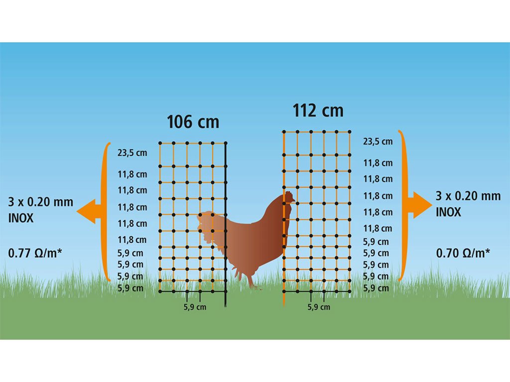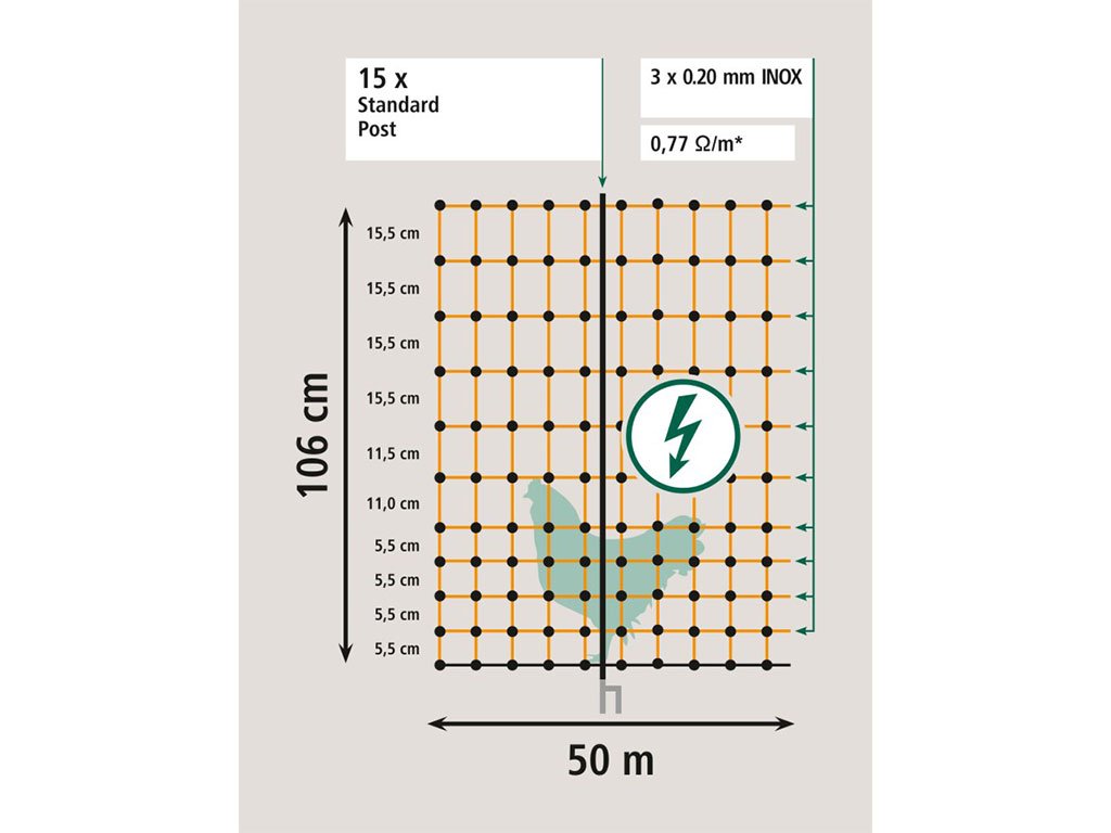 CZ popis | Vodivá síť pro drůbež, 15 tyček, výška 106 cm, délka 50 m, 2 hroty |